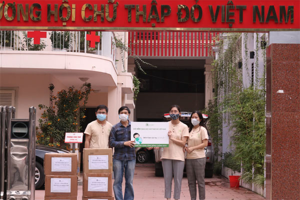 Đại diện Cỏ Mềm tặng gel rửa tay cho Hội chữ thập đỏ Việt Nam